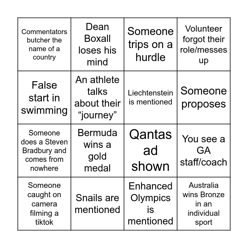 This bingo card has 27 words: Australia makes a gymnastics final, Australia wins gold in a team sport, Someone does a Steven Bradbury and comes from nowhere, The Eiffel tower is shown, An athlete talks about their “journey”, Someone trips on a hurdle, Dean Boxall loses his mind, Australia wins Bronze in an individual sport, Snails are mentioned, An Australian gymnast is interviewed, Qantas ad shown, Volunteer forgot their role/messes up, Child crying in the crowd, Celine Dion sings at Opening Ceremony, Bermuda wins a gold medal, Nepal wins a medal, Liechtenstein is mentioned, Someone proposes, Commentators butcher the name of an athlete, Commentators butcher the name of a country, Enhanced Olympics is mentioned, A horse goes rogue in equestrian, You see a GA staff/coach, Someone caught on camera filming a tiktok, An athlete gets caught smoking, False start in swimming and False start in athletics.