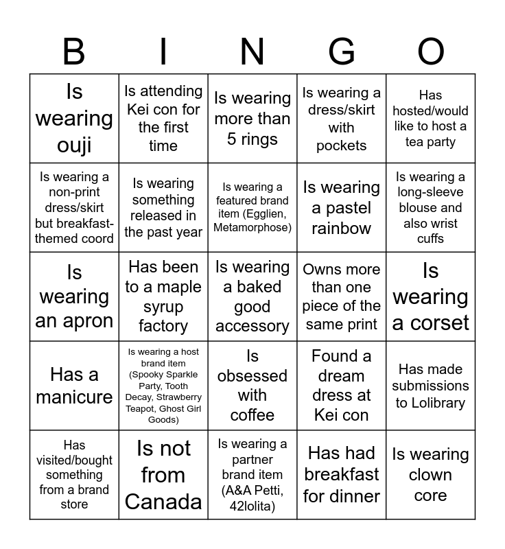 This bingo card has 25 words: Is wearing a host brand item (Spooky Sparkle Party, Tooth Decay, Strawberry Teapot, Ghost Girl Goods), Is wearing a partner brand item (A&A Petti, 42lolita), Is wearing a featured brand item (Egglien, Metamorphose), Has visited/bought something from a brand store, Has hosted/would like to host a tea party, Is wearing ouji, Is wearing a non-print dress/skirt but breakfast-themed coord, Is attending Kei con for the first time, Owns more than one piece of the same print, Is obsessed with coffee, Is wearing a pastel rainbow, Is wearing an apron, Found a dream dress at Kei con, Has made submissions to Lolibrary, Is wearing something released in the past year, Is wearing clown core, Is wearing a corset, Is wearing more than 5 rings, Is wearing a long-sleeve blouse and also wrist cuffs, Has been to a maple syrup factory, Is wearing a baked good accessory, Is not from Canada, Has a manicure, Is wearing a dress/skirt with pockets and Has had breakfast for dinner.