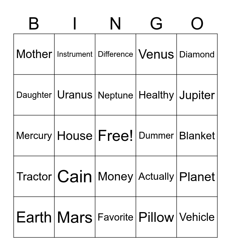 This bingo card has a free space and 27 words: Actually, Chocolate, Healthy, Favorite, Daughter, Difference, Instrument, Tractor, Dummer, Planet, Mercury, Venus, Earth, Mars, Jupiter, Saturn, Uranus, Neptune, Cain, Mother, Blanket, Pillow, House, Vehicle, Money, Diamond and Photo.