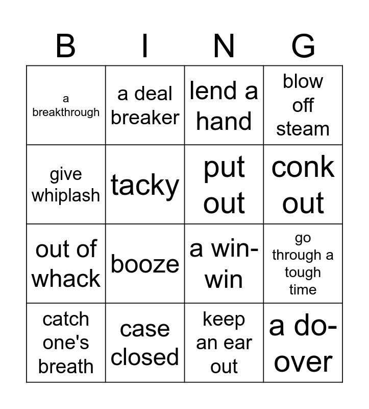 This bingo card has 16 words: case closed, go through a tough time, lend a hand, a breakthrough, out of whack, a deal breaker, a win-win, keep an ear out, give whiplash, tacky, catch one's breath, blow off steam, booze, conk out, put out and a do-over.
