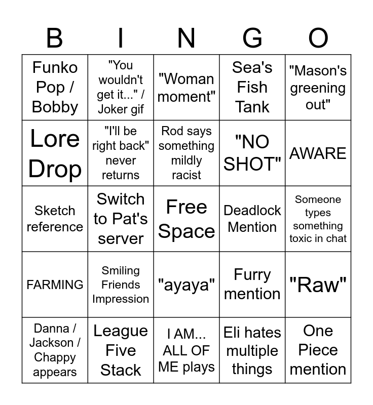 This bingo card has a free space and 24 words: Smiling Friends Impression, League Five Stack, Rod says something mildly racist, Danna / Jackson / Chappy appears, "Mason's greening out", Funko Pop / Bobby, Lore Drop, "You wouldn't get it..." / Joker gif, Deadlock Mention, "ayaya", "NO SHOT", Sketch reference, Furry mention, "Raw", "I'll be right back" never returns, Eli hates multiple things, Someone types something toxic in chat, "Woman moment", AWARE, Switch to Pat's server, One Piece mention, FARMING, Sea's Fish Tank and I AM... ALL OF ME plays.