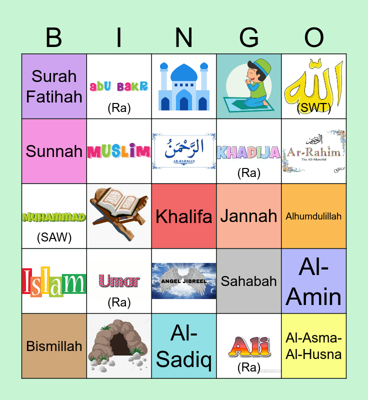 This bingo card has 15 images, a free space and 15 words: (Ra), Bismillah, (SWT), Surah Fatihah, Sunnah, (Ra), Jannah, (Ra), (SAW), Sahabah, Al-Amin, (Ra), Alhumdulillah, Al-Asma-Al-Husna and Al-Sadiq.