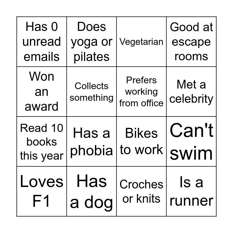 This bingo card has 1 images and 28 words: Has children, Can't swim, Plays an instrument, Has 0 unread emails, Vegetarian, Prefers working from office, Plays a sport, Has a dog, Is a Swiftie, Croches or knits, Loves F1, Same birth month as you, Received an award, Has a phobia, Loves true crime, Has food allergies, Is a runner, Won an award, Bikes to work, Can't cook, Only child, Read 10 books this year, Collects something, Good at escape rooms, Does yoga or pilates, Ran a marathon, Met a celebrity and Doesn't drink coffee.