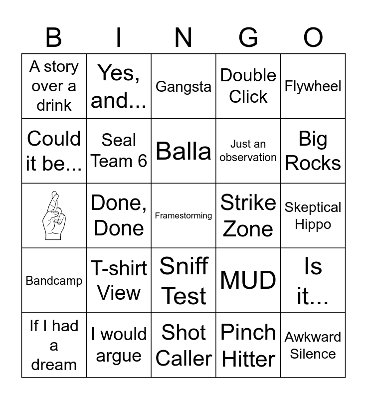 This bingo card has 1 images and 24 words: T-shirt View, Shot Caller, Balla, If I had a dream, Flywheel, A story over a drink, Could it be..., Yes, and..., Strike Zone, Sniff Test, Just an observation, MUD, Is it..., Seal Team 6, Awkward Silence, Skeptical Hippo, Gangsta, Big Rocks, Done, Done, Framestorming, I would argue, Bandcamp, Double Click and Pinch Hitter.