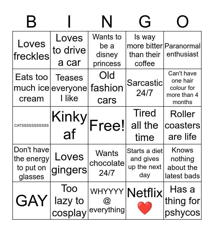 This bingo card has a free space and 24 words: Loves gingers, Too lazy to cosplay, Old fashion cars, GAY, Paranormal enthusiast, Loves freckles, Eats too much ice cream, Loves to drive a car, Tired all the time, Wants chocolate 24/7, Sarcastic 24/7, CATSSSSSSSSSSS, Starts a diet and gives up the next day, Knows nothing about the latest bads, Teases everyone I like, Netflix ❤️, Roller coasters are life, Wants to be a disney princess, Can't have one hair colour for more than 4 months, Kinky af, Has a thing for pshycos, Don't have the energy to put on glasses, Is way more bitter than their coffee and WHYYYY @ everything.