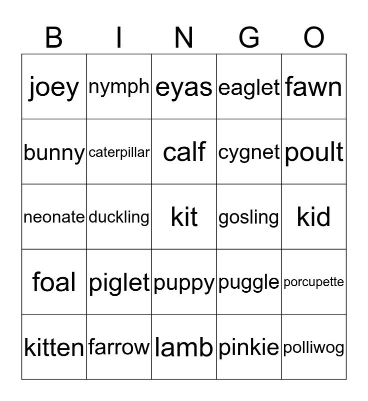 This bingo card has a free space and 39 words: cria, cub, chick, caterpillar, kitten, puppy, calf, whelp, fawn, foal, duckling, eaglet, polliwog, kid, gosling, piglet, baby, joey, fledgling, puggle, bunny, lamb, cygnet, poult, larva, hatchling, squab, fingerling, infant, nymph, cheeper, leveret, eyas, farrow, pinkie, peachick, porcupette, neonate and tadpole.