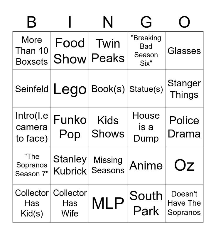 This bingo card has 54 words: "Breaking Bad Season Six", "The Sopranos Season 7", Seinfeld, House M.D, Missing Seasons, The Sopranos, "Breaking Bad Season Six", "The Sopranos Season 7", Seinfeld, Says "HBO", More Than 10 Boxsets, collector Is Fat, Collector Has Wife, Collector Has Kid(s), Breaking Bad/Better Call Saul, MLP, Kids Shows, Statue(s), Werid Breathing/Lip Smacking, Police Drama, Anime, Werid Taste, House is a Dump, Glasses, Collector Has Bad Opinion, Food Show, Non-DVD Related Item On Shelf, Complains About Simpsons Head Cases, The Simpsons, South Park, Blu-Ray Snob, DBZ, Madmen, David lynch, Twin Peaks, Owns Bad Show, Intro(I.e camera to face), Oz, Doesn't Have The Sopranos, Lego, Posters, Says Better Call Saul Is Better Than Breaking Bad, Neon Genesis Evangelion, Plushes, Stanley Kubrick, 2001: A Space Odyssey, No Tv Shows, No Films, Book(s), Funko Pop, Stanger Things, Guitar, Fargo and Comics.