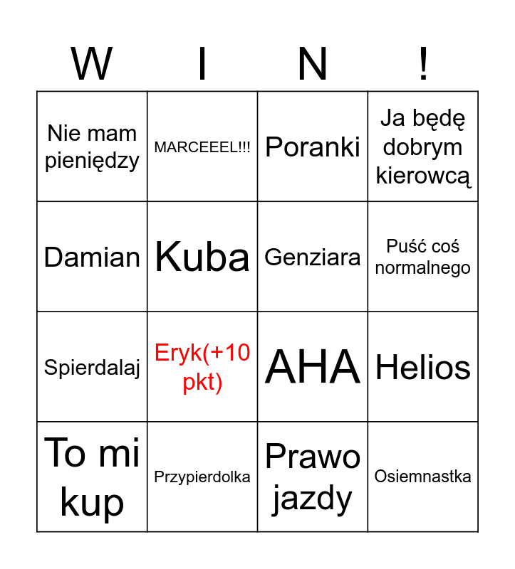 This bingo card has 16 words: Przypierdolka, Helios, Poranki, Nie mam pieniędzy, Spierdalaj, MARCEEEL!!!, AHA, Prawo jazdy, Damian, Kuba, To mi kup, Ja będę dobrym kierowcą, Eryk(+10 pkt), Puść coś normalnego, Genziara and Osiemnastka.