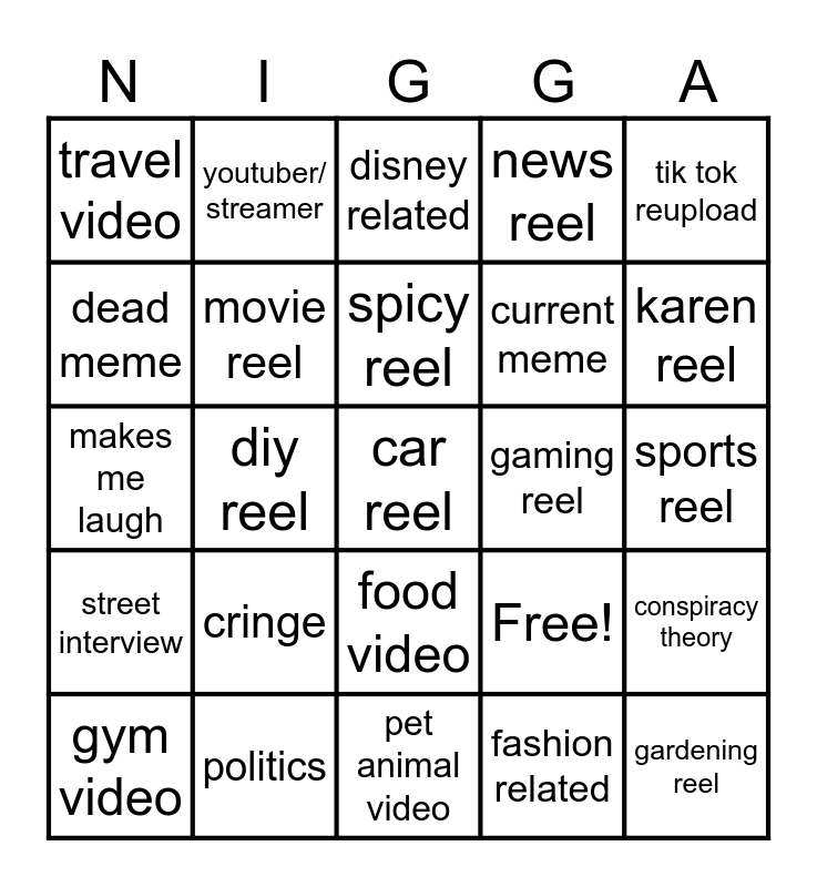This bingo card has 25 words: cringe, pet animal video, spicy reel, gym video, tik tok reupload, travel video, dead meme, youtuber/ streamer, gaming reel, food video, current meme, makes me laugh, Free!, conspiracy theory, movie reel, gardening reel, sports reel, disney related, karen reel, diy reel, car reel, politics, street interview, news reel and fashion related.