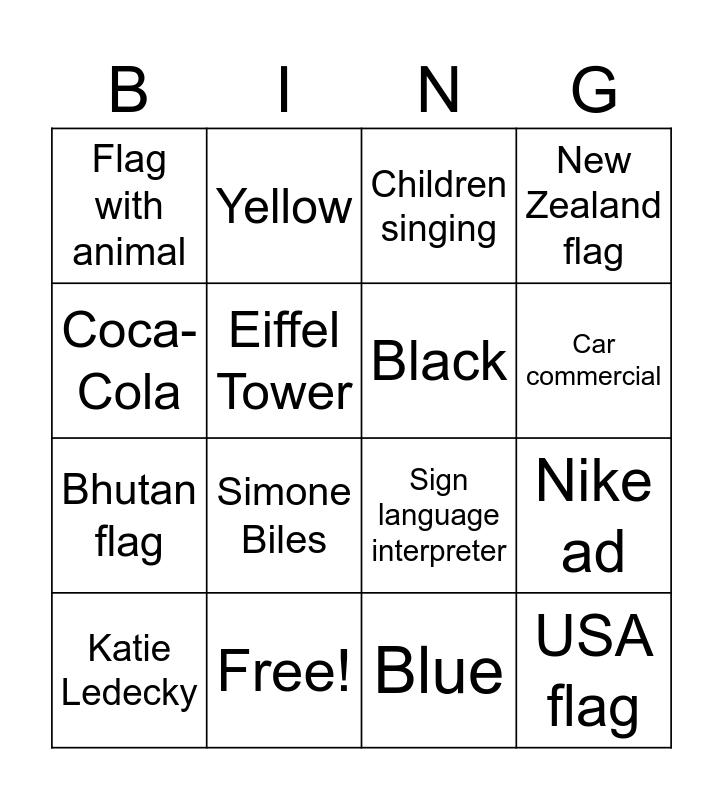 This bingo card has 21 words: Free!, Red, Yellow, Green, Blue, Black, Flag with animal, Children singing, Sign language interpreter, Car commercial, Bhutan flag, New Zealand flag, USA flag, Beret, Eiffel Tower, Sequins, Katie Ledecky, Simone Biles, Coca-Cola, Nike ad and Gatorade ad.