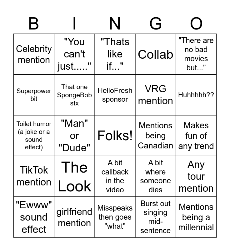 This bingo card has a free space and 26 words: A bit callback in the video, Burst out singing mid-sentence, HelloFresh sponsor, girlfriend mention, "There are no bad movies but...", Celebrity mention, Superpower bit, "You can't just.....", Makes fun of any trend, A bit where someone dies, VRG mention, Toilet humor (a joke or a sound effect), Any tour mention, "Ewww" sound effect, "Man" or "Dude", "Extra greeting", Collab, TikTok mention, "Thats like if...", Mentions being a millennial, Huhhhhh??, Misspeaks then goes "what", Mentions being Canadian, The Look, That one SpongeBob sfx and "Eueehhh??" Sound.