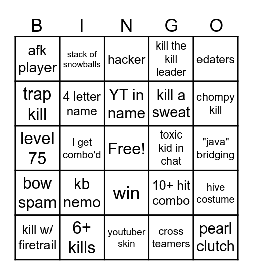 This bingo card has a free space and 24 words: kb nemo, 6+ kills, YT in name, kill w/ firetrail, edaters, afk player, trap kill, stack of snowballs, toxic kid in chat, win, kill a sweat, level 75, 10+ hit combo, hive costume, 4 letter name, cross teamers, "java" bridging, hacker, chompy kill, I get combo'd, pearl clutch, bow spam, kill the kill leader and youtuber skin.