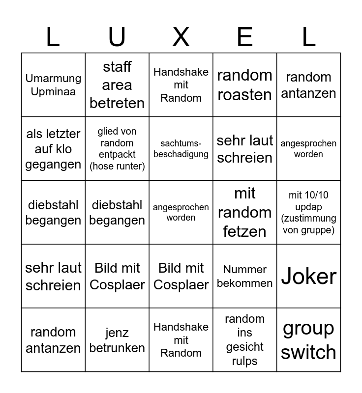 This bingo card has 50 words: group switch, angesprochen worden, flex valorant stats, Handshake mit Random, Bild mit Cosplaer, >5 alkoholische trunks getrunken, staff area betreten, girl weg-ekeln, als letzter auf klo gegangen, jenz betrunken, glied von random entpackt (hose runter), random roasten, Joker, Nummer bekommen, mit 10/10 updap (zustimmung von gruppe), mit random brainrot getalkt, sachtums- beschadigung, mit random fetzen, game match win, random antanzen, diebstahl begangen, random ins gesicht rulps, Umarmung Upminaa, sehr laut schreien, viel zu laut mitsingen, group switch, angesprochen worden, flex valorant stats, Handshake mit Random, Bild mit Cosplaer, >5 alkoholische trunks getrunken, staff area betreten, girl weg-ekeln, als letzter auf klo gegangen, jenz betrunken, glied von random entpackt (hose runter), random roasten, Joker, Nummer bekommen, mit 10/10 updap (zustimmung von gruppe), mit random brainrot getalkt, sachtums- beschadigung, mit random fetzen, game match win, random antanzen, diebstahl begangen, random ins gesicht rulps, Umarmung Upminaa, sehr laut schreien and viel zu laut mitsingen.
