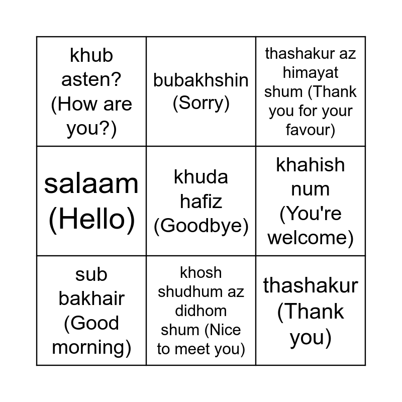 This bingo card has a free space and 8 words: khahish num (You're welcome), thashakur az himayat shum (Thank you for your favour), bubakhshin (Sorry), sub bakhair (Good morning), khub asten? (How are you?), thashakur (Thank you), salaam (Hello) and khosh shudhum az didhom shum (Nice to meet you).