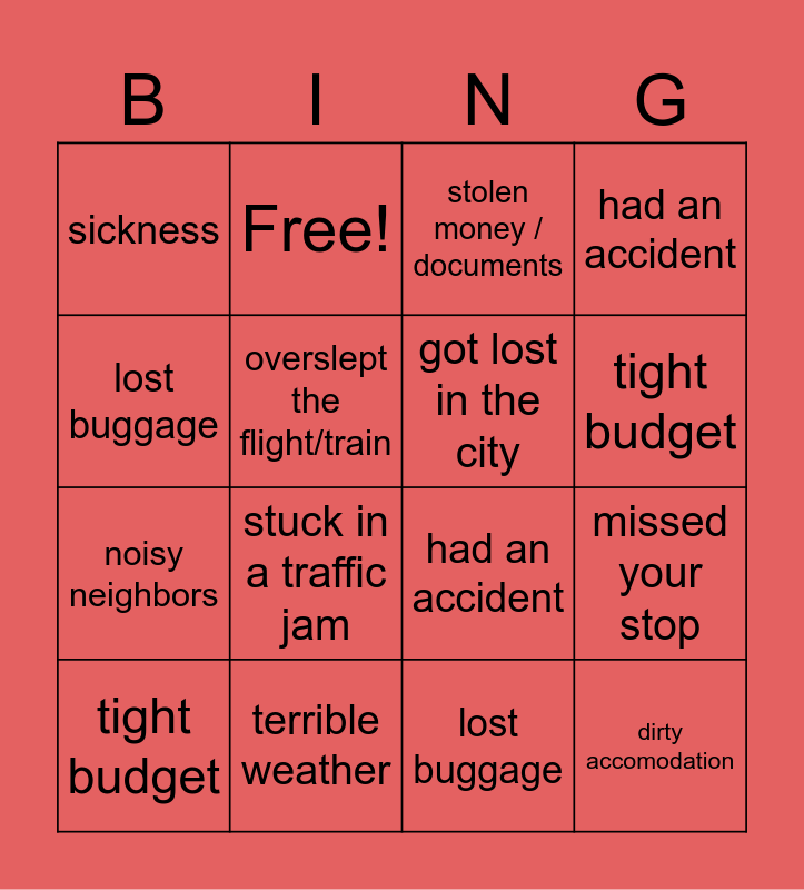 This bingo card has 19 words: had an accident, got sunburnt, stolen money / documents, dirty accomodation, missed your stop, lost buggage, lost buggage, sickness, Free!, noisy neighbors, stuck in a traffic jam, overslept the flight/train, got lost in the city, terrible weather, tight budget, crowded beach, had an accident, tight budget and crowded beach.