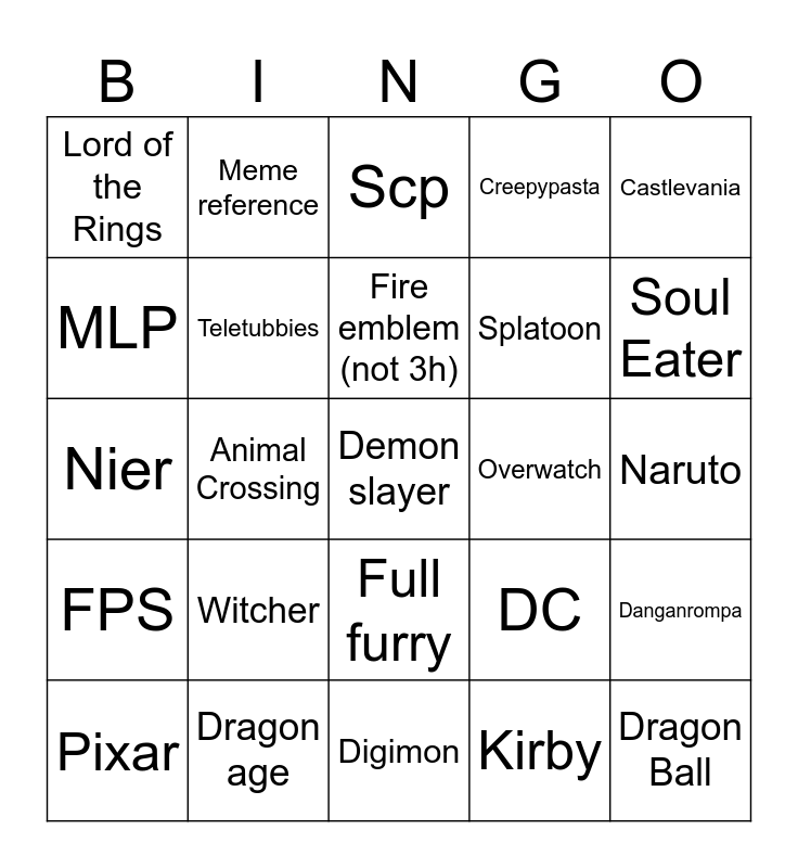 This bingo card has a free space and 24 words: Witcher, Dragon age, Fire emblem (not 3h), Pixar, Castlevania, Lord of the Rings, MLP, Meme reference, Overwatch, Full furry, Splatoon, Nier, DC, Danganrompa, Teletubbies, Kirby, Naruto, Scp, Soul Eater, Animal Crossing, Dragon Ball, FPS, Creepypasta and Digimon.