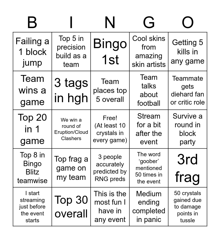 This bingo card has a free space and 24 words: Top frag a game on my team, Top 30 overall, Team places top 5 overall, I start streaming just before the event starts, Getting 5 kills in any game, Failing a 1 block jump, Team wins a game, Top 5 in precision build as a team, Stream for a bit after the event, 3 people accurately predicted by RNG preds, Team talks about football, Top 20 in 1 game, The word ‘goober’ mentioned 50 times in the event, 3rd frag, 3 tags in hgh, Medium ending completed in panic, Survive a round in block party, Bingo 1st, Teammate gets diehard fan or critic role, We win a round of Eruption/Cloud Clashers, 50 crystals gained due to damage points in tussle, Top 8 in Bingo Blitz teamwise, Cool skins from amazing skin artists and This is the most fun I have in any event.