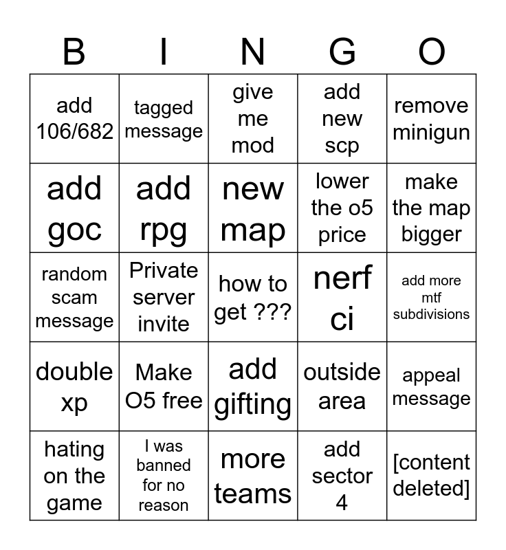 This bingo card has a free space and 24 words: Make O5 free, I was banned for no reason, new map, hating on the game, remove minigun, add 106/682, add goc, tagged message, nerf ci, add gifting, lower the o5 price, random scam message, outside area, appeal message, add rpg, add sector 4, add more mtf subdivisions, give me mod, make the map bigger, Private server invite, [content deleted], double xp, add new scp and more teams.