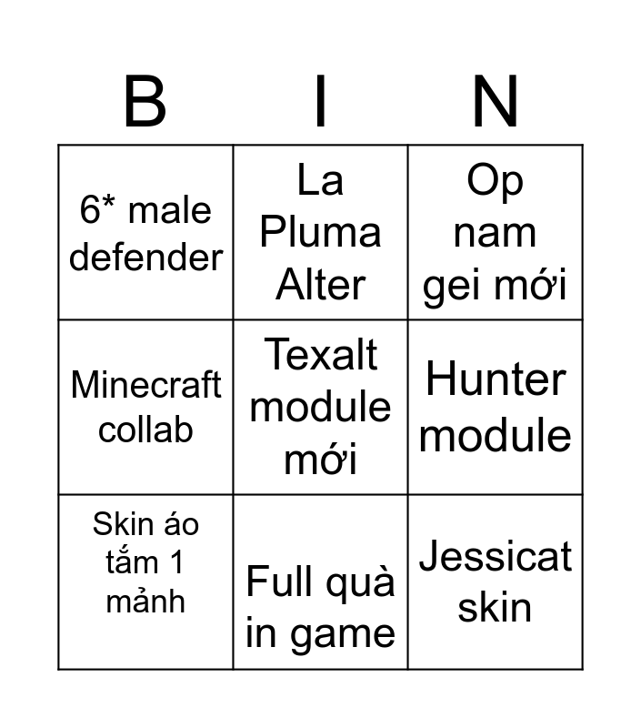This bingo card has 9 words: Skin áo tắm 1 mảnh, Op nam gei mới, La Pluma Alter, Minecraft collab, 6* male defender, Hunter module, Texalt module mới, Jessicat skin and Full quà in game.