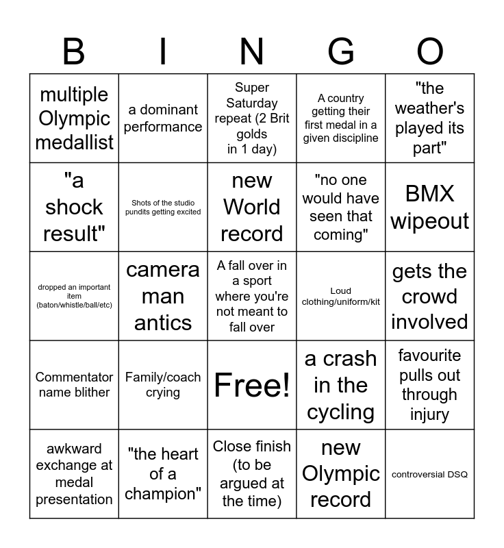This bingo card has 26 words: Free!, new Olympic record, new World record, "the heart of a champion", "the weather's played its part", multiple Olympic medallist, "a shock result", a dominant performance, gets the crowd involved, a crash in the cycling, "no one would have seen that coming", dropped an important item (baton/whistle/ball/etc), favourite pulls out through injury, awkward exchange at medal presentation, camera man antics, A favourite French man/woman crumbling from expectation, A country getting their first medal in a given discipline, Commentator name blither, Super Saturday repeat (2 Brit golds in 1 day), A fall over in a sport where you're not meant to fall over, BMX wipeout, Close finish (to be argued at the time), Loud clothing/uniform/kit, Family/coach crying, Shots of the studio pundits getting excited and controversial DSQ.