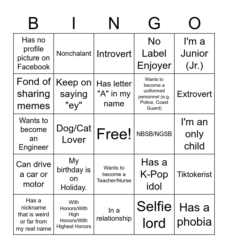 This bingo card has a free space and 24 words: My birthday is on Holiday., With Honors/With High Honors/With Highest Honors, Has letter "A" in my name, Has a nickname that is weird or far from my real name, I'm a Junior (Jr.), Has no profile picture on Facebook, Fond of sharing memes, Nonchalant, NBSB/NGSB, Wants to become a Teacher/Nurse, Wants to become a uniformed personnel (e.g. Police, Coast Guard), Wants to become an Engineer, Has a K-Pop idol, Tiktokerist, Keep on saying "ey", Selfie lord, I'm an only child, Introvert, Extrovert, Dog/Cat Lover, Has a phobia, Can drive a car or motor, No Label Enjoyer and In a relationship.
