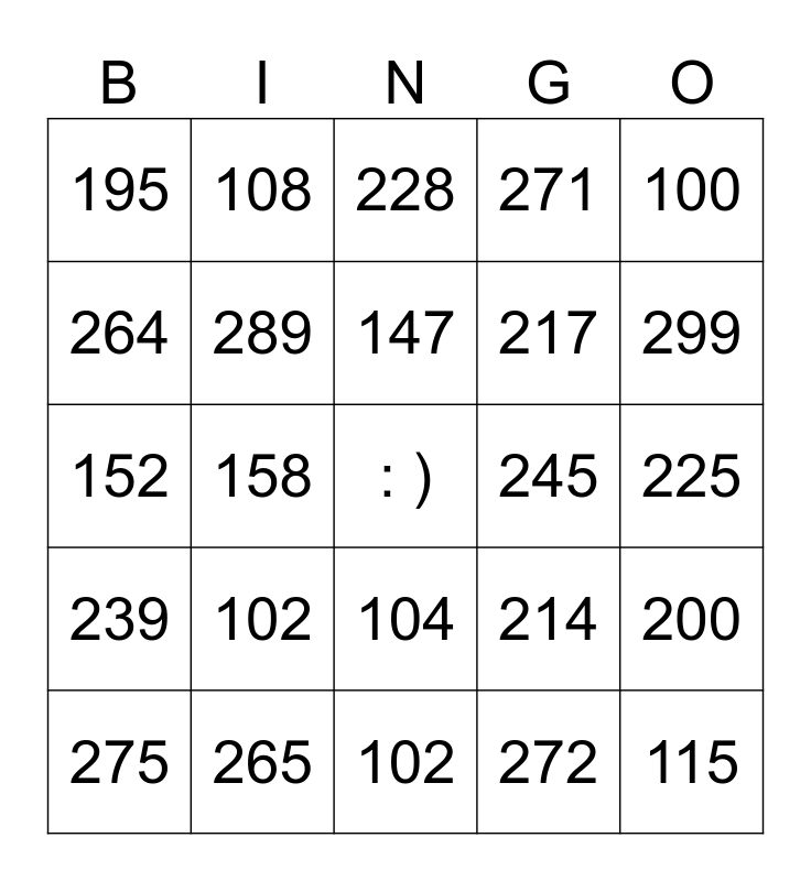 This bingo card has a free space and 24 words: 102, 265, 147, 275, 100, 195, 264, 108, 245, 104, 217, 152, 214, 200, 289, 272, 225, 228, 299, 158, 115, 239, 271 and 102.