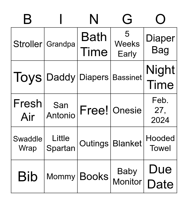 This bingo card has a free space and 45 words: Bottle, Mommy, Wipes, Blanket, Pajamas, Bib, Daddy, Noah, 5 Weeks Early, Due Date, Stroller, Aunt Cara, Onesie, Feb. 27, 2024, Crib, Uncle Emory, Baby Shampoo, Bassinet, Rattle, Fresh Air, Grandpa, Dreft, Baby Monitor, Diaper Bag, Car Seat, Grandma, Books, Formula, Hooded Towel, Swaddle Wrap, Cosin to Be!, Diapers, Burp Cloth, Laugh, Nigh Light, Little Spartan, Outings, Wash Cloth, Naps, Toys, San Antonio, Bath Time, Teething Ring, Night Time and Baby Boy.