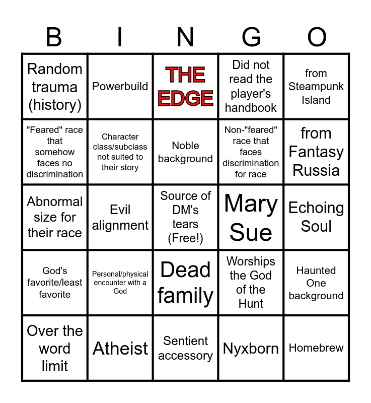 This bingo card has a free space and 24 words: Personal/physical encounter with a God, Atheist, Noble background, Over the word limit, from Steampunk Island, Random trauma (history), "Feared" race that somehow faces no discrimination, Powerbuild, Mary Sue, Dead family, Non-"feared" race that faces discrimination for race, Abnormal size for their race, Worships the God of the Hunt, Haunted One background, Character class/subclass not suited to their story, Nyxborn, Echoing Soul, THE EDGE, from Fantasy Russia, Evil alignment, Homebrew, God's favorite/least favorite, Did not read the player's handbook and Sentient accessory.