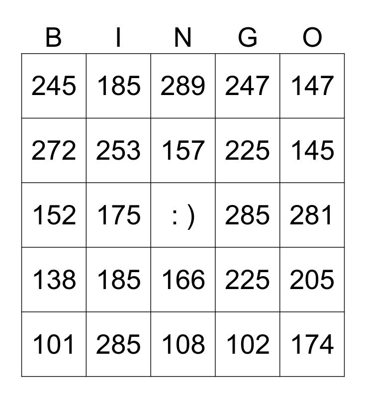 This bingo card has a free space and 24 words: 185, 285, 157, 101, 147, 245, 272, 185, 285, 166, 225, 152, 225, 205, 253, 102, 281, 289, 145, 175, 174, 138, 247 and 108.