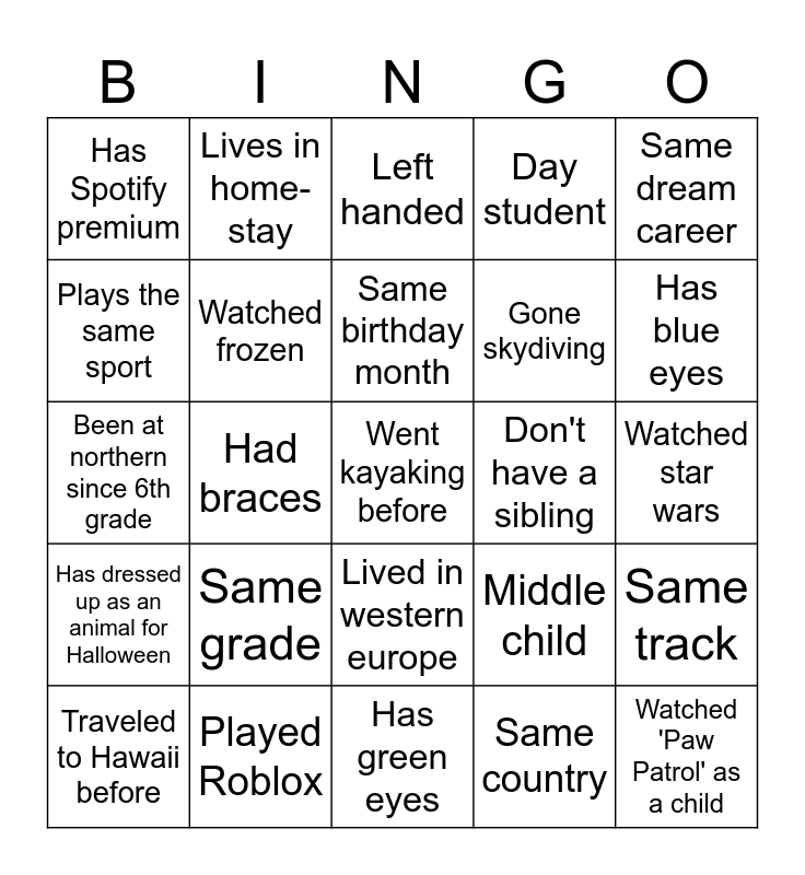 This bingo card has 42 words: Free!, Same birthday month, Same letter of first name, Same grade, Same country, Same track, Went kayaking before, Read all the harry potter books, Left handed, Lived in western europe, Watched star wars, Has blue eyes, Had braces, Same dream career, Went to northern summer camp, Middle child, Has a younger sibling, Been at northern since 6th grade, Has a sibling at northern, Lives in home-stay, Plays the same sport, Played on northern lions team, Watched 'Paw Patrol' as a child, Has Spotify premium, Has the same shoe size, Played Minecraft, Gone skydiving, Lived in eastern Europe, Gone canoeing, Been on a cruise, Knows how to solve a Rubik's cube, Has dressed up as an animal for Halloween, Watched frozen, Has green eyes, Has Hulu, Traveled to Hawaii before, Played Roblox, Don't have a sibling, Watched 'curious George' as a child, watched 'Sofia the First' as a child, Day student and Never switched tracks before.