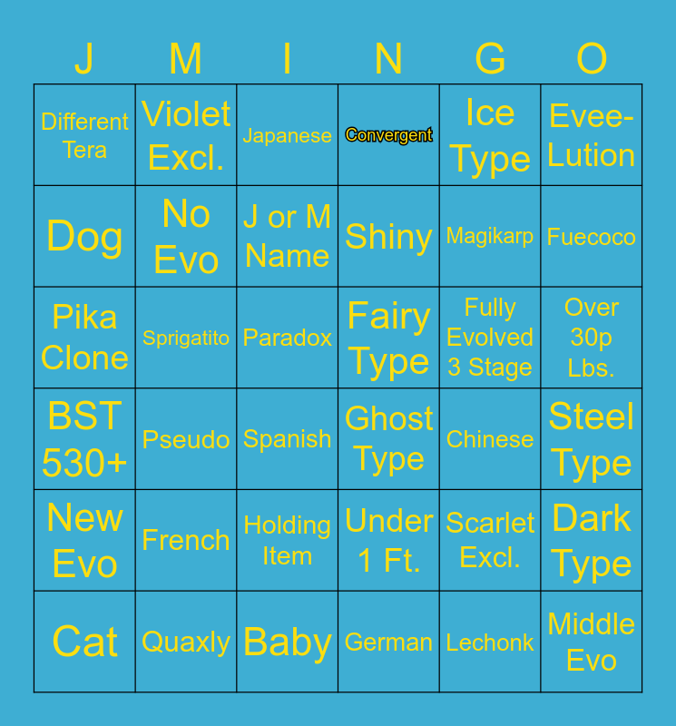 This bingo card has 36 words: Under 1 Ft., Holding Item, German, Dog, BST 530+, Fairy Type, No Evo, Baby, Ice Type, Scarlet Excl., Fuecoco, Convergent, Dark Type, Sprigatito, Shiny, Different Tera, New Evo, Fully Evolved 3 Stage, Pika Clone, Japanese, Paradox, Pseudo, Ghost Type, Spanish, Chinese, Violet Excl., Magikarp, Quaxly, J or M Name, Evee- Lution, Middle Evo, Cat, Steel Type, Over 30p Lbs., French and Lechonk.