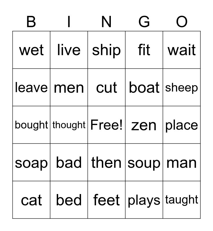 This bingo card has a free space and 24 words: bad, bed, cut, cat, wait, wet, leave, live, zen, then, boat, bought, soup, man, men, plays, place, ship, sheep, thought, taught, soap, fit and feet.