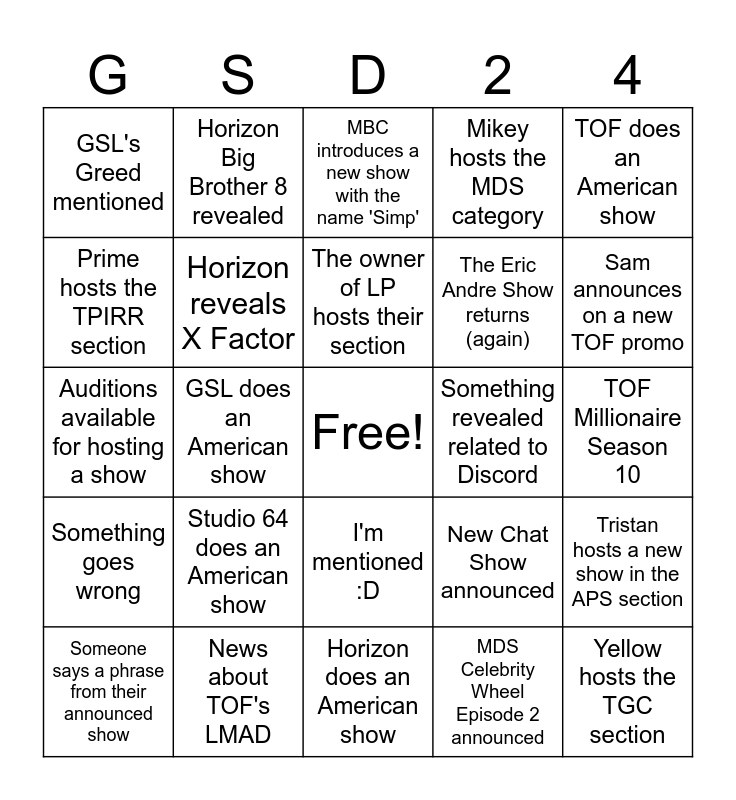 This bingo card has a free space and 24 words: Studio 64 does an American show, News about TOF's LMAD, The owner of LP hosts their section, Someone says a phrase from their announced show, TOF does an American show, GSL's Greed mentioned, Prime hosts the TPIRR section, Horizon Big Brother 8 revealed, Something revealed related to Discord, I'm mentioned :D, The Eric Andre Show returns (again), Auditions available for hosting a show, New Chat Show announced, Tristan hosts a new show in the APS section, Horizon reveals X Factor, MDS Celebrity Wheel Episode 2 announced, TOF Millionaire Season 10, MBC introduces a new show with the name 'Simp', Sam announces on a new TOF promo, GSL does an American show, Yellow hosts the TGC section, Something goes wrong, Mikey hosts the MDS category and Horizon does an American show.