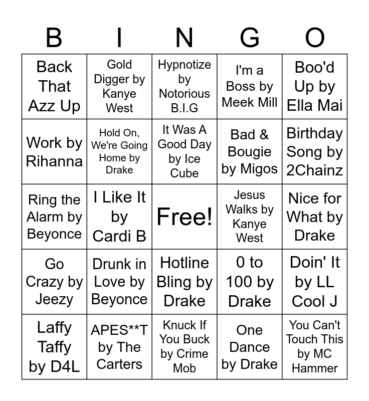 This bingo card has a free space and 51 words: Step in The Name of Love by R. Kelly, Drunk in Love by Beyonce, I Need Love by LL Cool J, One Dance by Drake, Birthday Song by 2Chainz, Summertime by Fresh Prince and DJ Jazzy Jeff, Gold Digger by Kanye West, Dreams and Nightmares by Meek Mills, Bad & Bougie by Migos, You Can't Touch This by MC Hammer, Ring the Alarm by Beyonce, Hold On, We're Going Home by Drake, 0 to 100 by Drake, Nice for What by Drake, Needed Me by Rihanna, Black Beatles by Rae Sremmurd, Hypnotize by Notorious B.I.G, Jesus Walks by Kanye West, 99 Problems by Jay Z, Work by Rihanna, I Like It by Cardi B, I'm The Plug by Future, I'm a Boss by Meek Mill, Boo'd Up by Ella Mai, All Eye On Me by 2Pac, One More Chance by Notorious B.I.G, It Was A Good Day by Ice Cube, Big Pimpin', Doin' It by LL Cool J, Back That Azz Up, Regulate, Poison, Pony, Bodak Yellow by Cardi B, DNA by Kendrick Lamar, Sky Walker by Miguel, Formation by Beyonce, Liquor by Chris Brown, Redbone by Childish Gambino, Rake It Up by Gotti, APES**T by The Carters, Hotline Bling by Drake, Uptown Funk by Bruno Mars, Down in the DM by Yo Gotti, Laffy Taffy by D4L, Int'l Players Anthem by UGK, Knuck If You Buck by Crime Mob, Still Fly by Big Tymers, A Bay Bay by Hurricane Chris, Go Crazy by Jeezy and Mama Said Knock You Out by LL Cool J.