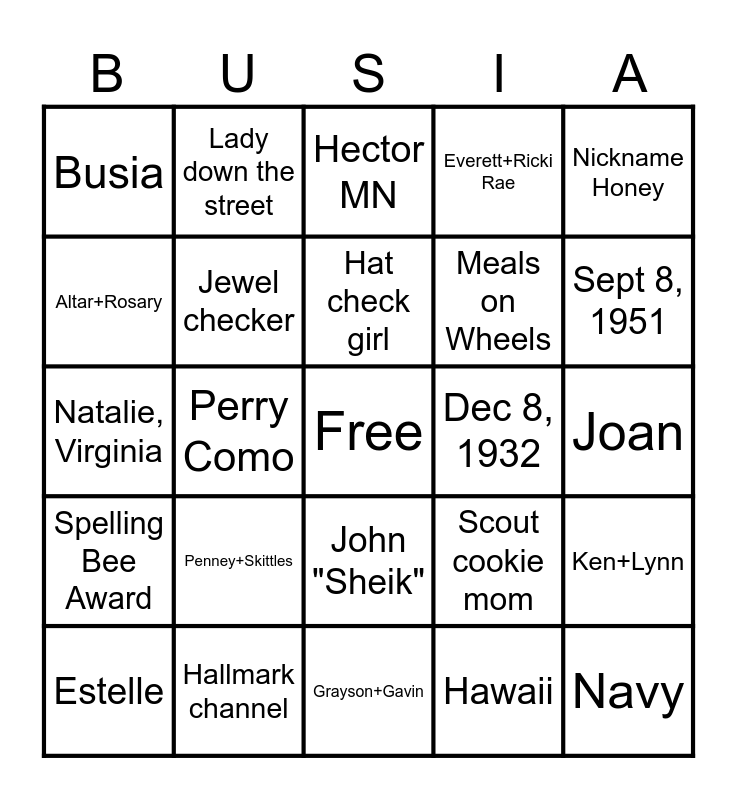This bingo card has a free space and 75 words: Janssen Ave Chicago, Franklin Park IL, Hector MN, Rolling Meadows IL, St Josaphat, Holy Family Academy, Waller H.S., Walt Disney World, Hawaii, Alaska, Panama Canal, Poland, Dec 8, 1932, Sept 8, 1951, 50th Wedding Anniversary, Jewel checker, Visited 50 States, Scout cookie mom, Waitress (Chi bar Assoc.), Altar+Rosary, Lioness, Hat check girl, Meals on Wheels, Nickname Honey, Busia, G.G., Nursing, Joseph+Phyllis Ziemblicki, Julie, Kathy+Brian, Kim+Mike, Mom, Karen, Ken+Lynn, Natalie, Virginia, Lady down the street, Kris+Bob, Helen, Joan, Estelle, Walter "Duke", Josephine, Taylor+Nick, Phil,Steph,Jake, Mel, Brit, Max, Rachel, John "Sheik", Everett+Ricki Rae, Polish Food, Blessed Mother Mary, Hot Dogs/ Coleslaw, Grayson+Gavin, Bowling, Dancing, Help your neighbor, Columbo, Golf, Collect marbles, Teal, Dumbo, Hallmark channel, Danielle Steel books, Sagittarius, Chocolate, Pearl Harbor song, Perry Como, Shirley Temple, Blue notes, "Patsy" doll, Spelling Bee Award, Penney+Skittles, Silver Fox, Bushman, Navy and Water ballons.