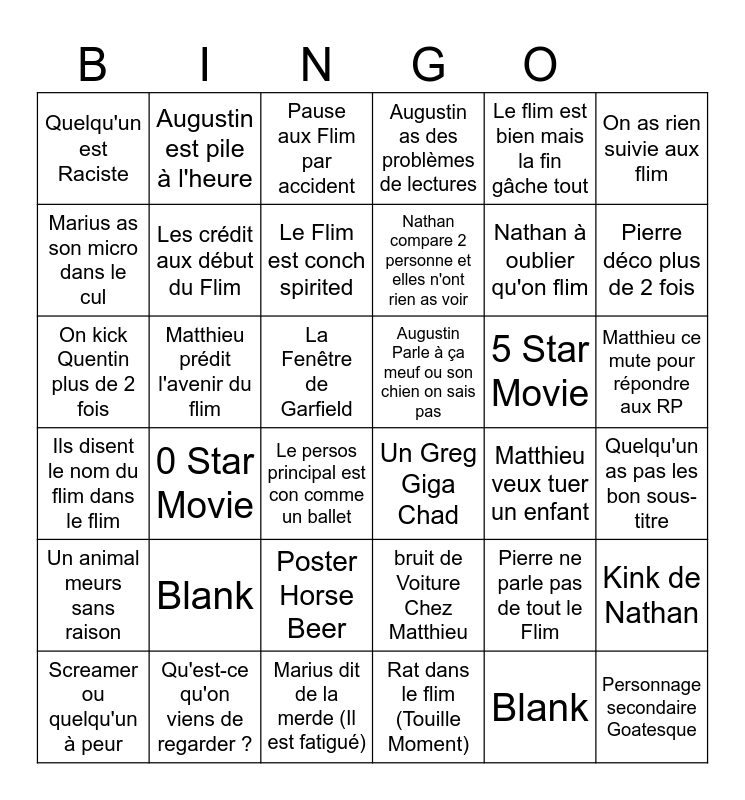 This bingo card has 36 words: bruit de Voiture Chez Matthieu, Poster Horse Beer, Rat dans le flim (Touille Moment), Marius as son micro dans le cul, Ils disent le nom du flim dans le flim, Augustin Parle à ça meuf ou son chien on sais pas, Les crédit aux début du Flim, Marius dit de la merde (Il est fatigué), Le flim est bien mais la fin gâche tout, Pierre ne parle pas de tout le Flim, Pierre déco plus de 2 fois, Augustin as des problèmes de lectures, Kink de Nathan, Matthieu prédit l'avenir du flim, Nathan compare 2 personne et elles n'ont rien as voir, Quelqu'un est Raciste, Un animal meurs sans raison, 5 Star Movie, On kick Quentin plus de 2 fois, Pause aux Flim par accident, La Fenêtre de Garfield, 0 Star Movie, Un Greg Giga Chad, Le persos principal est con comme un ballet, Matthieu veux tuer un enfant, Augustin est pile à l'heure, Nathan à oublier qu'on flim, Qu'est-ce qu'on viens de regarder ?, Le Flim est conch spirited, On as rien suivie aux flim, Personnage secondaire Goatesque, Screamer ou quelqu'un à peur, Quelqu'un as pas les bon sous-titre, Matthieu ce mute pour répondre aux RP, Blank and Blank.