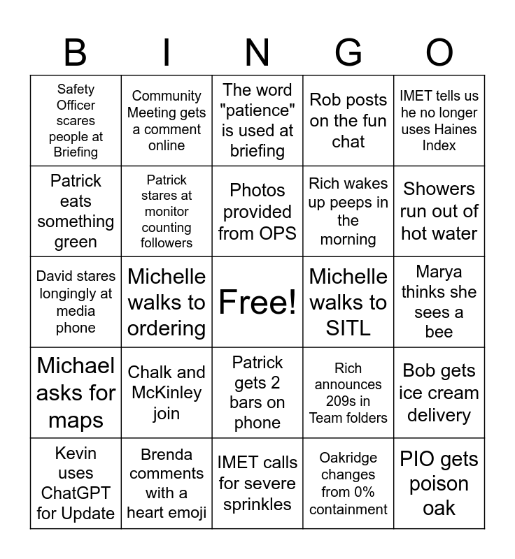 This bingo card has a free space and 24 words: Chalk and McKinley join, Brenda comments with a heart emoji, Photos provided from OPS, Kevin uses ChatGPT for Update, IMET tells us he no longer uses Haines Index, Safety Officer scares people at Briefing, Patrick eats something green, Community Meeting gets a comment online, Michelle walks to SITL, Patrick gets 2 bars on phone, Rich wakes up peeps in the morning, David stares longingly at media phone, Rich announces 209s in Team folders, Bob gets ice cream delivery, Patrick stares at monitor counting followers, Oakridge changes from 0% containment, Marya thinks she sees a bee, The word "patience" is used at briefing, Showers run out of hot water, Michelle walks to ordering, PIO gets poison oak, Michael asks for maps, Rob posts on the fun chat and IMET calls for severe sprinkles.