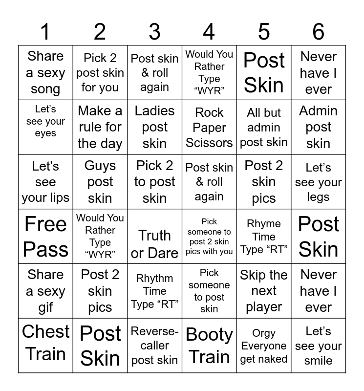 This bingo card has 36 words: Pick someone to post skin, Rhythm Time Type “RT”, Booty Train, Let’s see your eyes, Free Pass, Post skin & roll again, Make a rule for the day, Reverse-caller post skin, Post Skin, Skip the next player, Admin post skin, Would You Rather Type “WYR”, Never have I ever, Guys post skin, Rock Paper Scissors, Share a sexy song, Share a sexy gif, Post 2 skin pics, Let’s see your lips, Post skin & roll again, Pick 2 to post skin, Would You Rather Type “WYR”, Pick someone to post 2 skin pics with you, Truth or Dare, Rhyme Time Type “RT”, Pick 2 post skin for you, All but admin post skin, Post Skin, Ladies post skin, Never have I ever, Let’s see your smile, Chest Train, Post Skin, Let’s see your legs, Post 2 skin pics and Orgy Everyone get naked.
