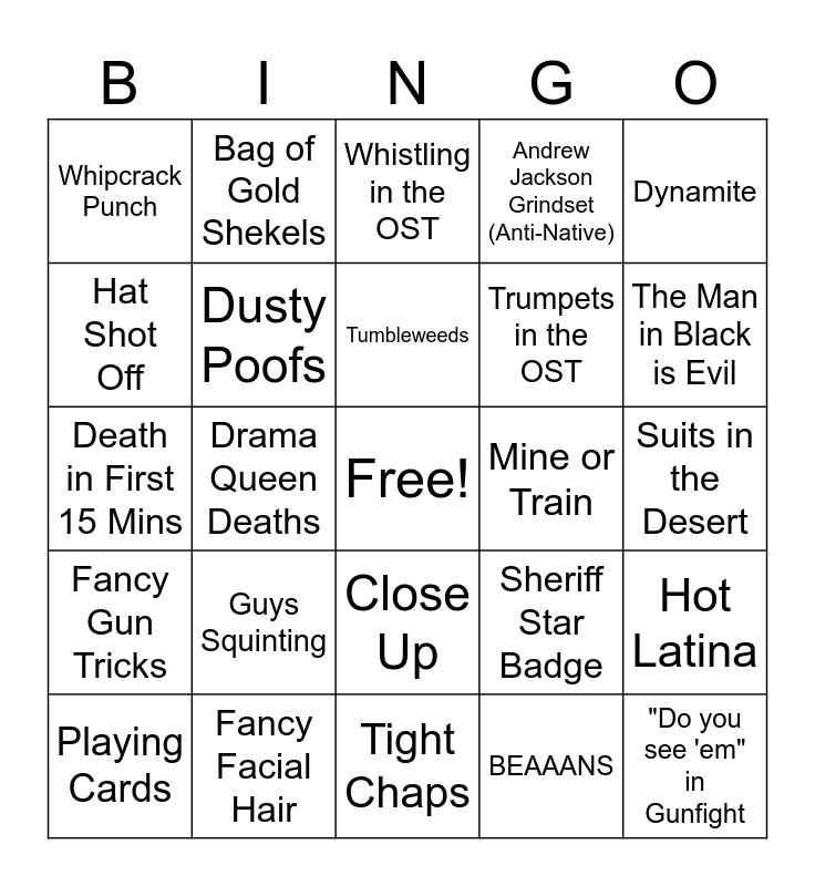 This bingo card has a free space and 32 words: BEAAANS, Big Cigars, Drama Queen Deaths, Badly Synched Audio, Fancy Gun Tricks, Dusty Poofs, Dynamite, Hot Latina, Bag of Gold Shekels, Bottle of Tequila, Tumbleweeds, Whistling in the OST, Whiskey (Stated not Implied), M'Lady Hat Tip Greeting, Mine or Train, Laughing Mexicans, Playing Cards, Death in First 15 Mins, Close Up, Guys Squinting, Sheriff Star Badge, Rapid Killing Spree, Suits in the Desert, Fancy Facial Hair, "Do you see 'em" in Gunfight, Andrew Jackson Grindset (Anti-Native), Trumpets in the OST, Hat Shot Off, Whipcrack Punch, Tight Chaps, Barbershop Shootout and The Man in Black is Evil.