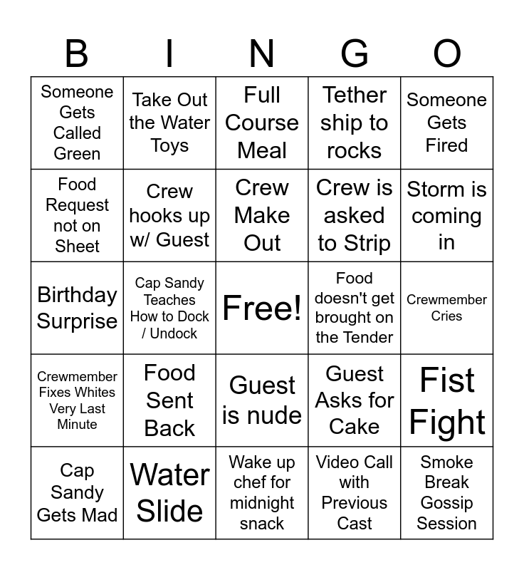 This bingo card has a free space and 24 words: Food Sent Back, Water Slide, Crew Make Out, Cap Sandy Gets Mad, Someone Gets Fired, Someone Gets Called Green, Food Request not on Sheet, Take Out the Water Toys, Food doesn't get brought on the Tender, Guest is nude, Crew is asked to Strip, Birthday Surprise, Guest Asks for Cake, Fist Fight, Crew hooks up w/ Guest, Video Call with Previous Cast, Crewmember Cries, Full Course Meal, Storm is coming in, Cap Sandy Teaches How to Dock / Undock, Smoke Break Gossip Session, Crewmember Fixes Whites Very Last Minute, Tether ship to rocks and Wake up chef for midnight snack.