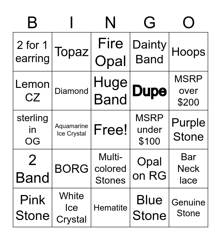 This bingo card has a free space and 24 words: BORG, White Ice Crystal, Huge Band, Pink Stone, Hoops, 2 for 1 earring, Lemon CZ, Topaz, MSRP under $100, Multi-colored Stones, Dupe, sterling in OG, Opal on RG, Bar Neck lace, Diamond, Blue Stone, Purple Stone, Fire Opal, MSRP over $200, Aquamarine Ice Crystal, Genuine Stone, 2 Band, Dainty Band and Hematite.