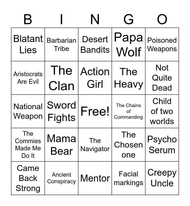 This bingo card has a free space and 24 words: Mama Bear, Ancient Conspiracy, Action Girl, Came Back Strong, Poisoned Weapons, Blatant Lies, Aristocrats Are Evil, Barbarian Tribe, The Chains of Commanding, The Navigator, The Heavy, National Weapon, The Chosen one, Psycho Serum, The Clan, Facial markings, Child of two worlds, Desert Bandits, Not Quite Dead, Sword Fights, Creepy Uncle, The Commies Made Me Do It, Papa Wolf and Mentor.