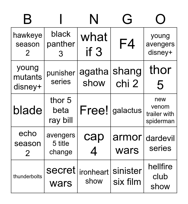 This bingo card has a free space and 24 words: avengers 5 title change, secret wars, agatha show, thunderbolts, young avengers disney+, hawkeye season 2, young mutants disney+, black panther 3, galactus, cap 4, shang chi 2, blade, armor wars, dardevil series, punisher series, sinister six film, new venom trailer with spiderman, what if 3, thor 5, thor 5 beta ray bill, hellfire club show, echo season 2, F4 and ironheart show.