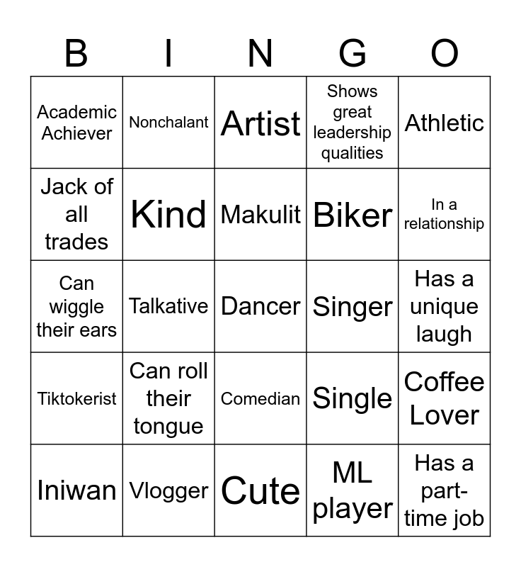This bingo card has 25 words: Tiktokerist, Vlogger, Dancer, ML player, Athletic, Academic Achiever, Nonchalant, Artist, Singer, Coffee Lover, Jack of all trades, Kind, Cute, Single, In a relationship, Iniwan, Talkative, Makulit, Biker, Has a unique laugh, Can wiggle their ears, Can roll their tongue, Comedian, Shows great leadership qualities and Has a part-time job.