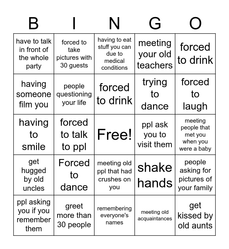 This bingo card has a free space and 24 words: Forced to dance, greet more than 30 people, forced to drink, ppl asking you if you remember them, forced to drink, have to talk in front of the whole party, having someone film you, forced to take pictures with 30 guests, ppl ask you to visit them, meeting old ppl that had crushes on you, trying to dance, having to smile, shake hands, people asking for pictures of your family, people questioning your life, meeting old acquaintances, meeting people that met you when you were a baby, having to eat stuff you can due to medical conditions, forced to laugh, forced to talk to ppl, get kissed by old aunts, get hugged by old uncles, meeting your old teachers and remembering everyone's names.