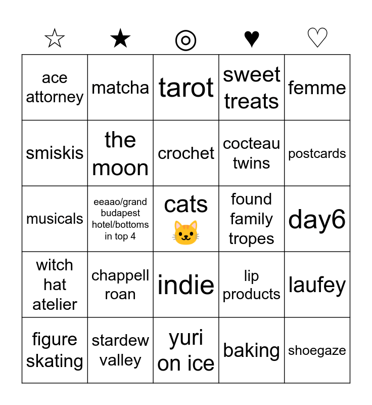 This bingo card has a free space and 24 words: chappell roan, stardew valley, crochet, figure skating, femme, ace attorney, smiskis, matcha, found family tropes, indie, cocteau twins, musicals, lip products, laufey, the moon, baking, day6, tarot, postcards, eeaao/grand budapest hotel/bottoms in top 4, shoegaze, witch hat atelier, sweet treats and yuri on ice.
