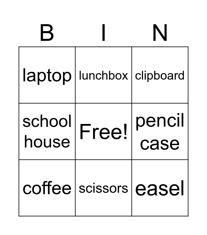 This bingo card has a free space and 19 words: apple, check, clipboard, crayons, cross, easel, glue, laptop, lunchbox, paper, pencil, pencil case, coffee, heart, backpack, school bus, school house, scissors and whiteboard.