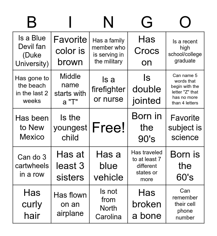 This bingo card has a free space and 24 words: Has at least 3 sisters, Has flown on an airplane, Is a firefighter or nurse, Has curly hair, Is a recent high school/college graduate, Is a Blue Devil fan (Duke University), Has gone to the beach in the last 2 weeks, Favorite color is brown, Born in the 90's, Has a blue vehicle, Is double jointed, Has been to New Mexico, Has traveled to at least 7 different states or more, Born is the 60's, Middle name starts with a "T", Has broken a bone, Favorite subject is science, Has a family member who is serving in the military, Can name 5 words that begin with the letter "Z" that has no more than 4 letters, Is the youngest child, Can remember their cell phone number, Can do 3 cartwheels in a row, Has Crocs on and Is not from North Carolina.