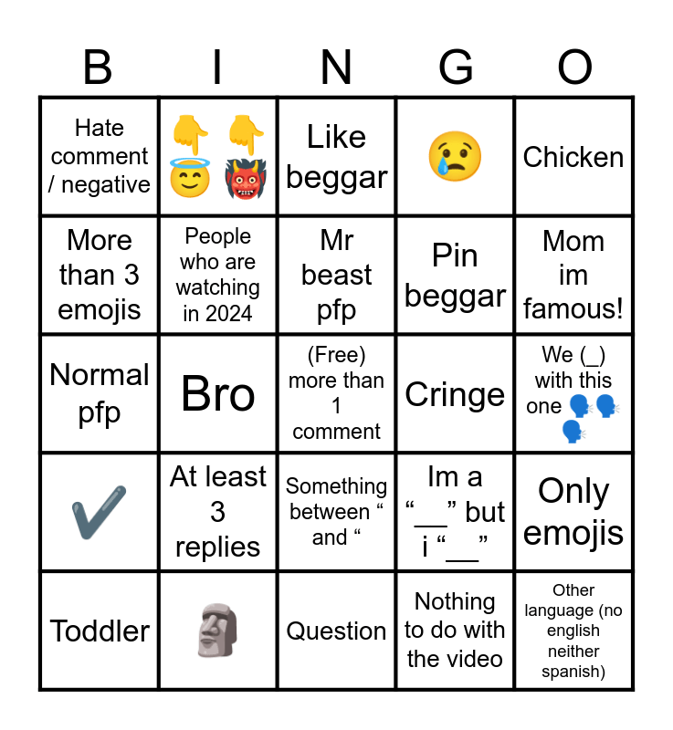 This bingo card has a free space and 29 words: Toddler, 💀, Bro, :❎ :✅, Hate comment / negative, Like beggar, People who are watching in 2024, At least 3 replies, Cringe, 🗿, We (_) with this one 🗣️🗣️🗣️, Other language (no english neither spanish), Question, Nothing to do with the video, Mom im famous!, Edited, Something between “ and “, ✔️, Chicken, Normal pfp, Im a “__” but i “__”, Spanish comment, Pin beggar, More than 3 emojis, 😢, 👇 👇 😇 👹, Only emojis, Mr beast pfp and Owner of the video.