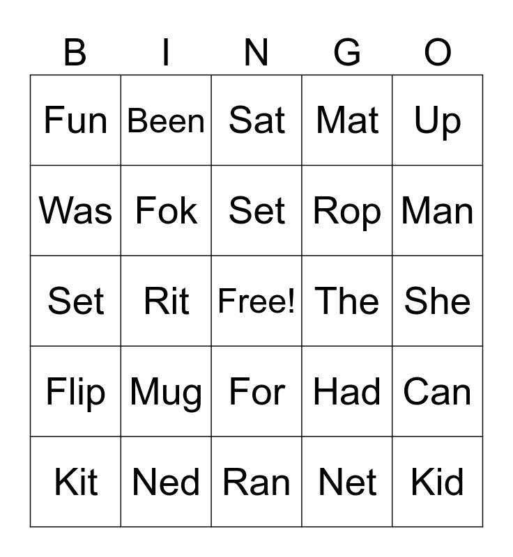 This bingo card has a free space and 24 words: Mug, Ned, Set, Kit, Up, Fun, Was, Been, The, For, Rop, Set, Had, Can, Fok, Net, She, Sat, Man, Rit, Kid, Flip, Mat and Ran.